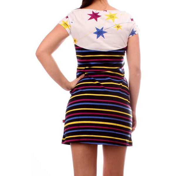 LLUVIA DE ESTRELLAS model. Short sleeve dress, crew neck and long over the knees, printed in bright colors on flat knitted fabric.