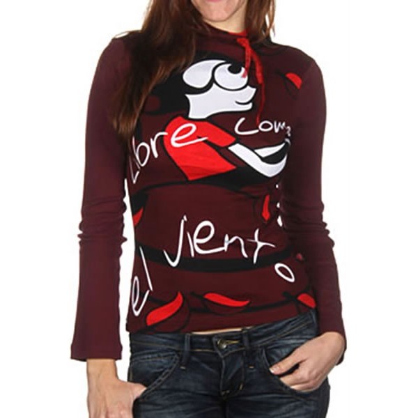 Camiseta familia LIBRE COMO EL VIENTO. Tejido de punto inglés. Estampado con colores marrón, rojo, negro y blanco. Cuello alto decorado con una pequeña cinta roja, manga larga y largo total hasta la cadera.