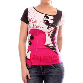 Modelo ME LO HA DICHO UN PAJARITO. Camiseta manga corta y cuello asimétrico, estampada con alegres colores sobre tejido de punto inglés (tejido con elasticidad).