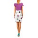 Vestido sin manga, combinado con rayas asimetricas en varios tonos de morado y caracoles, partes lisa con lazo de detalle. para estar fresquita y a la moda