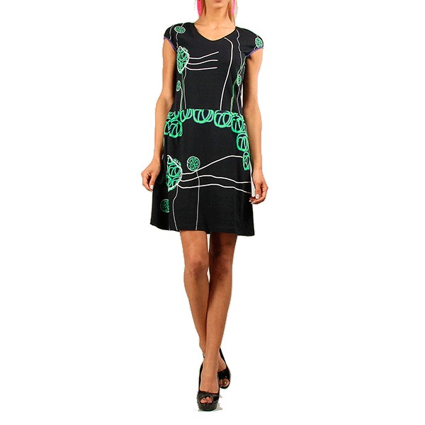 Vestido MICROORGANISMOS MARINOS, cuello pico con mangas japonesas acabadas con puntilla, y piezas combinadas del mismo estampado.